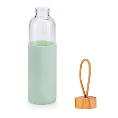 Glass bottle with bamboo lid and silicone sleeve