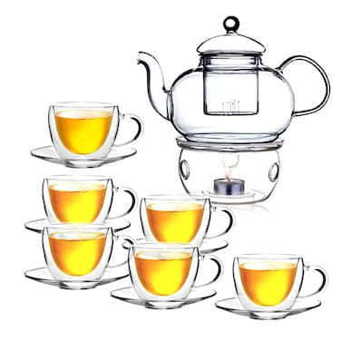 LIYING Double Wall Glass Teapot Set Combined With Teapot 1 x 600ml ,1 Candle Warmer , Clear Classic designedTeacups and Sauce [6 x 120ml], Heat-resistant Stovetop Dishwasher Safe Teapot with Removab