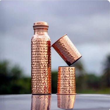This exquisite copper bottle with two glasses is not only a stylish accessory but also a practical and healthy choice for storing and carrying drinking water. Its numerous benefits make it a must-have item for anyone who values their health and well-being. Thanks to its antibacterial properties, the copper bottle helps to keep the water safe and free from harmful bacteria. Additionally, it aids in digestion, reduces inflammation, and is believed to balance the three doshas according to Ayurvedic medicine. The copper bottle is also a natural booster for the immune system, promotes healthy skin, and provides an overall sense of wellness. Regular cleaning with a mixture of lemon juice and water is recommended to maintain the bottle's shine and prevent tarnishing.