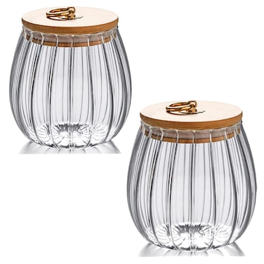- Borosilicate Glass Storage Jar With Airtight Bamboo Lid and Metal Handle, Set of 2, 700 ML Oval