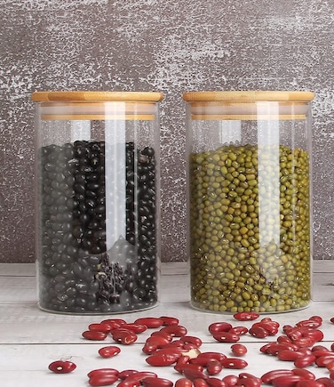 - Borosilicate Round Glass Storage Jars with Airtight Bamboo Lids Set of 2 750 ML