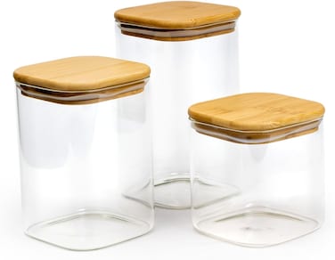Cuisine Art Square Glass Storage Jars with Bamboo Wood Lids -Set of 3 Transparent Borosilicate Airtight Glass Container, for Storing Kitchen Food, Grains, Coffee Beans, Tea 650+1020+1300ML