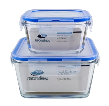 Mondex Glass Food Container With Clips Clear/Blue 400ml+900ml 2 PCS