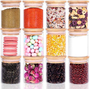 - <p>[Pack of 12] The small mason jar's size is 65mm*80mm, great for creating your own spice combinations, or using for meal preparation, making your pantry organized.<p>[Upgrade Lid] We upgrade glass food storage jar's lids for air-tight seal, keep food fresh longer and protect against air moisture or bugs. Great for dry foods, such as sugar, loose leaf tea , cookies, cereals and spices or other ingredients.<p>[Healthy choice] The glass canisters set is made of food-grade high borosilicate glass, 100% lead-free, non-toxicis, is healthier than plastic jars. Withstands temperature -4℉~302℉ , suitable for all kinds of environments. Dishwasher and microwave safe (Except Lids).<p>[Clear Design] The wooden lid and transparent glass offer minimalist and modern design, you can use them as candy jars, which is a beautiful gift package for children.<p>Product Description:<p>Specifications: Name: Glass Storage Jar with Lid / Glass Spice Jar/ Small Mason Jar/ Candy Jar/ Cookie Jar/ Tea canister Capacity: 175ml/ 6 OZ Size: height - 80mm, bottom diameter - 65mm Material: high-quality heat resistant borosilicate glass, nature bamboo lid Withstand temperature: -20℃ ~ 150℃/-4℉~302℉. refrigerator safe& microwave safe(except the lid) Function: Perfect for sugar, rice, coffee beans, candy, cookies, loose leaf tea, pet food, and etc Why choose Leaves and Trees? The lid is detachable and the stain can be easily cleaned. Nature bamboo lid with baby & medical safe rubber ring: close tightly Thicken borosilicate glass: BPA & Lead free. -20℃~150℃/ 0℉~400℉ Safe. More durable than other glass. Wash easily: Dishwasher-safe, but hand-wash recommended for glass jar. Well packaged: A wonderful gift for Christmas, Easter, Halloween, Thanksgiving Day, Mother's Day, Father's Day and Other Holidays. Package included: 12 x Glass Food Jars 12 x Nature Bamboo Lids with Rubber Rings 1 x Food Label