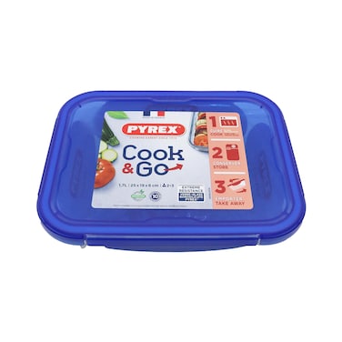 Pyrex Cook & Go Rectangular Food Container With Lid Clear/Blue 1.7L