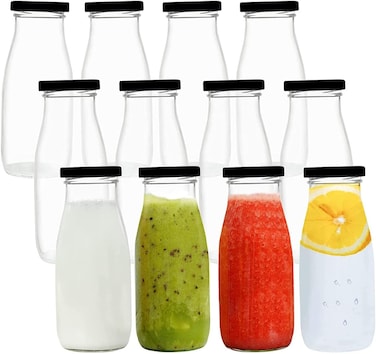 Star Cook 300ml Glass Bottles, Clear Glass Milk Bottles with Black Metal Airtight Lids, Vintage Breakfast Shake Container, Vintage Drinking Bottles with of 12pack