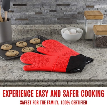 - <p>SAY GOODBYE TO BURNS! Our cooking gloves are heat resistant up to 500°F / 260°C durable and extra long to protect your hands and forearms from burns when using the grill or oven racks.<p>SAFE FOR THE WHOLE FAMILY: Set of 2 oven gloves with outer liner made from 100% BPA free FDA approved waterproof silicone with a soft and comfortable inner liner of 50% cotton and 50% polyester.<p>NEVER DROP A HOT POT AGAIN! These silicone oven mitts are comfortable, flexible and feature a lifted pattern for a textured and non-slip grip better than using pot holders. Our heat resistant gloves maintain a non-skid grip when reaching for heavy roasting pans, baking trays and dutch ovens.<p>CLEAN IN SECONDS! Cotton oven mitts are a hassle to keep clean, our silicone grill gloves are easily cleaned with warm water and soap. The inner quilted liner can be pulled out to clean, but is sewn at the seams so it’s never lost! Loops for easy storage.<p>THE ONLY OVEN MITTS YOU’LL EVER NEED: We’re so confident that you will love your pair of professional heat resistant oven gloves and if you are not completely happy please contact us and we’ll make it right!<p> Heat-Resistant : Offering protection up to 450°F, our oven gloves with quilted cotton lining offer improved comfort while cooking and grilling. Unmatched Quality: Crafted with FDA-approved, BPA-free silicone, our silicone gloves for cooking and grill use are backed by a 100% satisfaction guarantee. Non-Slip Grip:These silicone oven mitts are flexible, breathable and provide an improved control and stability thanks to a non-skid, textured palm. Superior Safety Length:With the lengths of 14.7”, our heat-resistant cooking gloves better protect fingers, hands and wrists from burns. Kitchen & Grill Versatility : Kitchen cooking gloves helps protect hands while holding hot plates and dishware, working over the grill or reaching into ovens.