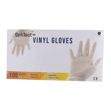 The OptiTect Powder-Free Vinyl Glove Extra-Large White comes in a pack of 100 gloves.