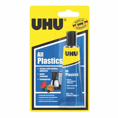 - <p>Ideal to bond plastics, multi-purpose domestic applications, handicraft work, repairs and model building, Resistant to approx. +90°C temperature & against water & oil, Remains transparent on wood, paper, cardboard, leather, metals, glass, ceramics, Note: Application guide available on pack for proper usage Box Contents:1 x UHU Allplast Universal Plastic Adhesive Glue at 33 ml