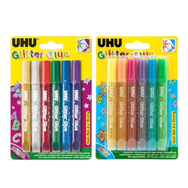 The UHU Glitter Glue Multicolour 10ml 6 PCS Pack of 2 is a set of 12 glitter glue tubes.