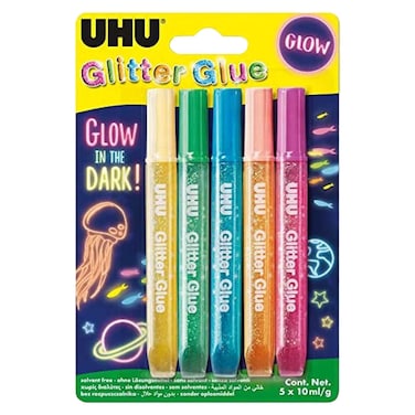 The UHU Glow in The Dark Glitter Glue Pen Multicolour is a set of 5 pens, each containing 10ml of glow in the dark glitter glue.