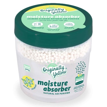 - WHAT IS ORIGINALLY YELLOW NATURAL MOISTURE ABSORBER? Powered by the natural mineral calcium chloride, this product is designed to capture humidity in the air and convert it back to water at the bottom of the container. This purifies the air, balances humidity levels and helps eliminate foul smells.