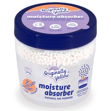 - WHAT IS ORIGINALLY YELLOW NATURAL MOISTURE ABSORBER? Powered by the natural mineral calcium chloride, this product is designed to capture humidity in the air and convert it back to water at the bottom of the container. This purifies the air, balances humidity levels and helps eliminate foul smells.