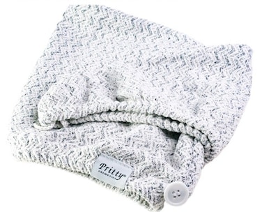 The towel wraps easily like a turban around wet hair. It has a button and elastic so you can clip it on. Suitable for all hair types.