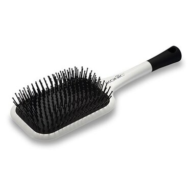 This Paddle Brush boast flexible bristles that softly glide through wet or dry hair, and suitable for all hair types, from fine and straight to tightly curled. The ion bristles produce ions from the energy created by brushing motion and its reaction. The ideal brush for those with long hair, this large paddle will detangle without creating static.