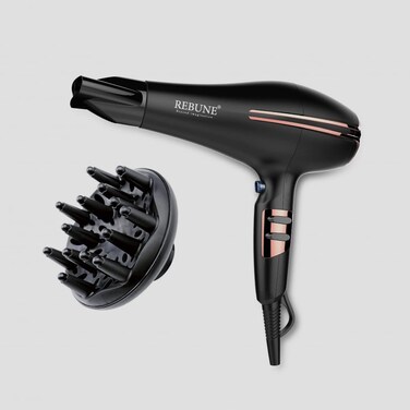 Model number: RE-2079 Suitable for all hair types. Heats up in minutes. Special head for wavy hair. Power: 2200W / 50-60Hz / 220-240V. Number of Attached Pieces: 2 This modern hair dryer from Rebune professionally dries your hair in no time, thus helping you protect your hair from breakage and falling out if it stays wet for a long time.