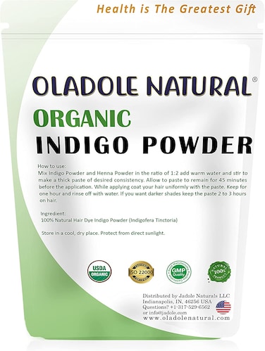 Oladole Natural indigo Powder Hair Dye Color 100% Natural and Organic, Cruelty FREE, 100% Vegan Pesticides FREE, Zero Chemicals, 1 Pack = 100 Grams Net Weight of the Product Excellent Natural Alternative to chemical Oladole Natural indigo also works as a nice hair conditioner. So, you don't need to use a separate conditioner after using natural hair dye. Brown hair dye: When henna & indigo both applied to hair it gives lovely dark brown color to the hairs. Black hair dye: When indigo and amla applied to hair it gives black hair color. Amla is more as a hair nutrition-er than hair color. Oladole Natural committed to producing the highest quality products and Natural Herbs that sustainably sourced and fairly traded. All our products are 100% natural and processed in FDA. Oladole Natural products bring you closer to nature & mother earth. How to use: Mix Indigo Powder and Henna Powder in the ratio of 1:2 add warm water and stir to make a thick paste of desired consistency. Allow to paste to remain for 45 minutes before the application. While applying coat your hair uniformly with the paste. Keep for one hour and rinse off with water. If you want darker shades keep the paste 2 to 3 hours on hair. Ingredient: Organic Hair Dye Indigo Powder (Indigofera Tinctoria) 100% Natural