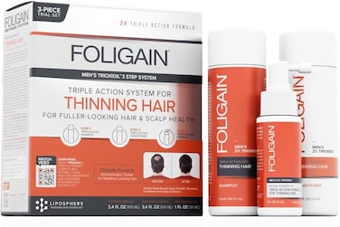 Our paraben & sulfate-free revitalizing hair product, Foligain's Triple Action Hair Care System is made with our most potent 10% Trioxidil blend which targets hair from root to tip for the look of added density, fullness, and youthful vitality. The Liposphere micro-emulsion technology infuses hair and scalp with our exclusive 10% Trioxidil complex is the secret to our hydrating conditioner. The revitalizing hair formula is very easy to use. Apply 4 sprays to the scalp twice per day directly to area of hair loss or thinning. Leave on the scalp for 4 (or more) hours and then wash it. An advanced biotin shampoo, our volumizing shampoo also contains important hair nutrients such as Biotin and is boosted by Trichogen, Procapil, copper peptides and pea sprout extract for a truly comprehensive solution. Size and Other Details: This travel hair care set comes with trial size deep cleansing shampoo for men (3.4 Fl Oz), lightweight conditioner (3.4 Fl Oz.) and 10% complete formula serum (1 Fl Oz).