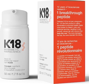 - <li>AN AT-HOME Leave-In Treatment infused with the patented K18Peptide that renews hair to its most youthful, healthy state. Benefits: Works to repair even the most extreme damage caused by bleach and color, chemical services, and heat.<li>CREATES LIKE HAIR LIKE NEW: Traveling into the inner-most layers of hair to reach the core polypeptide chains our revolutionary K18Peptide is just the right size and makeup to reconnect broken chains responsible for hair strength and elasticity.<li>RENEWS ALL HAIR TYPES: K18 doesn't just hide damage or patch it up leaving hair brittle, it transforms even the most extreme damage into hair that looks and feels like new. K18 works on all hair types, all generations, all types of expression.<li>LASTING RESULTS THAT WON'T WASH AWAY: The K18Peptide mimics the natural building blocks of hair and therefore is recognized as naturalso its able to integrate itself with the keratin chains to rebuild and restore hair immediately and over time.<li>BACK BY BIOTECH: K18 is the worlds first patented biotech treatment that renews chemically damaged hair from the inside out in just 4 minutes, strength, softness, smoothness, and bounce are restored for hair that looks and feels like new.<li>Product Dimensions: 4.83 x 4.83 x 10.16 cm, 90.72 Grams