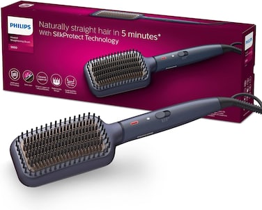 Naturally straight hair in 5 minutes Reveal naturally straight, beautifully shiny hair in just 5 minutes. Our SilkProtect technology with ionic care system work together with the bristle design for healthy looking, frizz-free hair. Care and protect Triple bristle design SilkProtect minimizes heat damage on hair Argan oil infused ceramic coating 3 temperature settings to suit your hair type Ease of use Swivel cord 1.8m cord for maximum flexibility Fast heat-up time Large paddle-shaped brush Ready to use indicator light Product Features SilkProtect technology Temperature of the bristles stays at an optimized level to minimize the heat damage, while reducing friction. Leaving hair naturally straight with a silky smooth look. Triple bristle design Triple bristle design gently detangles and straightens while protecting your scalp from heat. Paddle-shaped brush The paddle-shaped design to straighten more hair in one go. Argan ceramic coating The bristles with argan oil infused ceramic coating glide smoothly through your hair for naturally straight and shiny look.