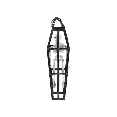 The 16-inch skeleton is suspended inside a coffin, with its bony hands and feet visible through the coffin's transparent sides. The skeleton is adorned with vibrant multi-coloured accents, making it a standout piece for your Halloween decor.