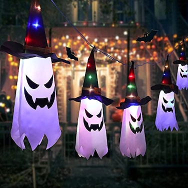 Halloween Decorations Ideas: Decor this halloween with ghost witch hats, your home will drive into the spooky vibes. Halloween decorations outdoor props come in 5 pcs ghost witch hats measure 18.11'' x 7.87'', 6 LED lights in each hat, total wire length: 138''..