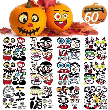Woochic Halloween Pumpkin Decorating Stickers, Jack-O-Lantern Face Decals Kit For Pumpkins And Squashes, 60 Cute Expressions Crafts Stickers Treat Party Supplies Idea Gifts Kids
