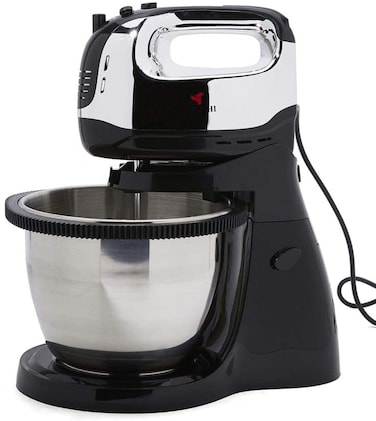 5 speeds stand mixer powerful motor 300W 2 beaters for mixing egg and cream 2 hooks for mixing dough with 3.0L stainless steel rolatable bowl with chrome plastic body AC 220-240V, 50/60Hz. 300W
