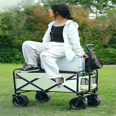 HEXAR® Heavy Duty Shopping Trolley Folding Multi-Functional Portable Utility Wagon Beach Trolley Storage Basket Outdoor Camping Garden Cart with Adjustable Handle (ALL TERRAIN WIDE WHEELS - BEIGE)