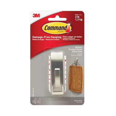 3M Command Brushed Nickel Medium Metal Hook offers easy, damage-free hanging of frames and other decor