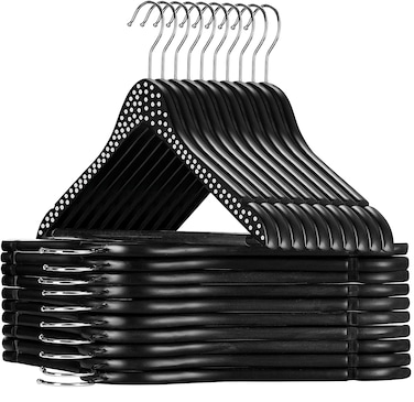 ATTRACTIVE DESIGN - These deluxe wooden hangers are crafted of smooth, finished wood with a charming black & white polka-dotted design. An additional layer of lacquer will preserve the smooth feel and muted luster of the hangers.