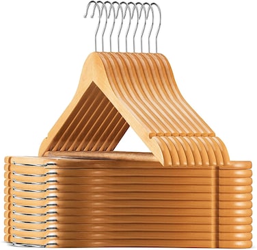 Set of 30 premium lotus wood suit hangers. These luxurious clothes hangers are unlike the rest, made of exceptional quality clear varnished wood with all practical features as a 360 degree chrome hook, a grooved, vinyl covered pant bar, and a contoured shoulder line with perfectly cut notches.