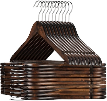 - Set of 30 premium lotus wood suit hangers. These luxurious clothes hangers are unlike the rest, made of exceptional quality clear varnished wood with all practical features as a 360 degree chrome hook, a grooved vinyl covered pant bar, and a contoured shoulder line with perfectly cut notches.
