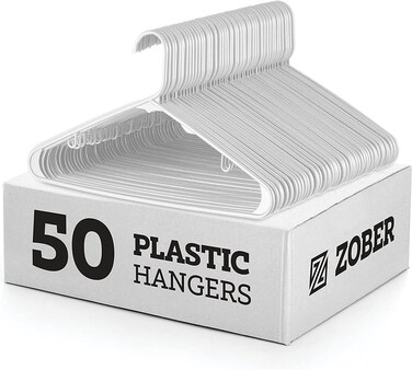 ZOBER Standard White Plastic Hangers - Pack of 50 - with Strap Hooks 16.5 Inch, Durable & Slim Space Saving Tubular Clothes Hangers, For Pants, Shirt, Dress, Underwear, Bra Etc. Hangs up to 5.5 lbs