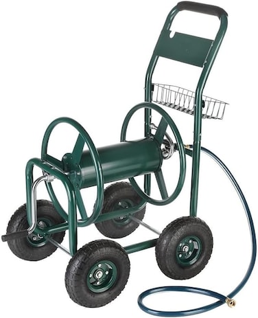 Powder Coated, Rust Resistant Steel Construction Frame Stores and easily transports a garden hose 10 inch Rubber Pneumatic wheel Hose Capacity: 70m garden hose / 120m garden hose Winding Reel Type: Manual crank Rubber Grip Convenient Winding Handle Inlet Hose is Included for easy connection to Tap Storage basket to keep your Garden Accessories Product dimension: (L x W x H) 95 x 57 x 100cm Weight: 17kgs