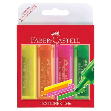 The Faber-Castell Textliner Super Fluorescent Highlighters Set FC154604 is a set of four highlighters in vibrant multicolours.