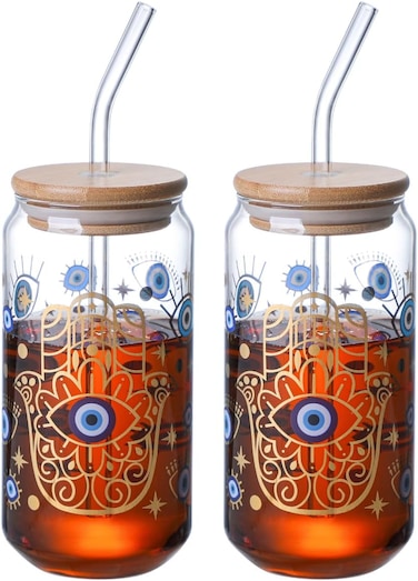 1CHASE Borosilicate Evil Eye Printed Drinking Glasses With Bamboo Lid And Glass Straw, 550ml, Mason Jar, Can Shaped Tumblers - Set Of 2