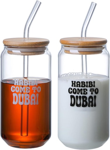 1CHASE Borosilicate "Habibi Come To Dubai" Printed Drinking Glasses With Bamboo Lid And Glass Straw, 550ml, Can Shaped Glass Cups - Set Of 2