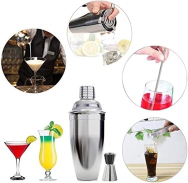 - COCKTAIL SHAKER and STRAINER SET - 5 piece barware tool set for making perfectly mixed drinks and craft cocktails. Includes 18oz martini shaker with strainer and leak proof lid top, dual jigger shot glass, drink stirrer spoon and mini ice tongs