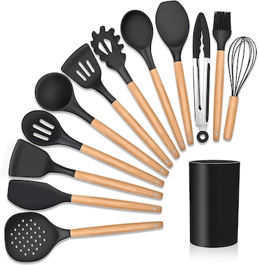 - Rubik Kitchen Utensils Silicone 11-Pieces Spatula Set with Organizer Cup Holder, Non-Stick Non-Toxic Cooking Tools Includes Tongs, Spatula, Turner, Ladle and More (Black)