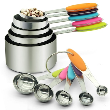 SKY-TOUCH 10 Piece Measuring Cups and Measuring Spoons Set with Detachable Ring – Stainless Steel Stackable 5 Cups 5 Spoons with Silicone Grip Handle to Measure Dry Liquid Food for Cooking or Baking