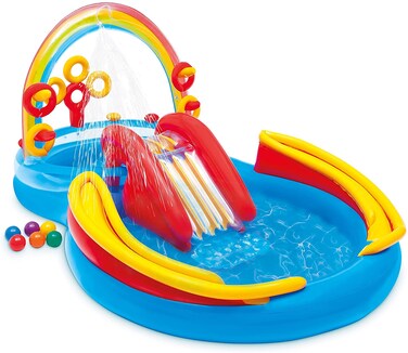 - <p>Comes ready for Fun with 6 Play Balls and 4 Inflatable Rings<p>Built-In Sprayer attaches easily into a standard Garden Hose<p>Great size for small backyards<p>Product Dimensions: <p>40.6 x 40.6 x 14 cm, 6.6 Kilograms