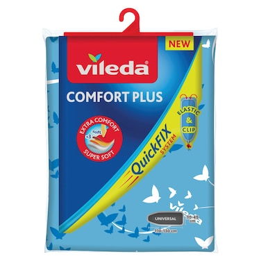 The Vileda Comfort Plus Aluminium Ironing Board Cover in Blue and White is designed to provide a comfortable and efficient ironing experience.