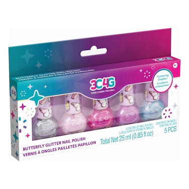 The Three Cheers For Girls Butterfly Glitter Nail Polish Set includes five 25ml bottles of vibrant and sparkly nail polish. Perfect for young girls who love to experiment with fun and colourful nail designs!