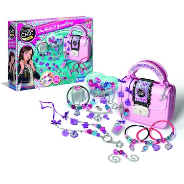 A beautiful and fashionable handbag with metallic clasp containing a romantic chest full of accessories to create super-glam jewellery! An original kit with lots of multifaceted and metallised beads, chains and pendants to customise and make trendy jewellery! The bag is designed to store all the components and creations so you can always carry your jewellery workshop with you!