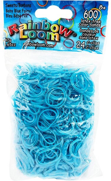 Product Description Rainbow Loom-Sweets: Baby Blue Fairy Rubber Bands. Includes 600 Rubber Bands. Includes 25 c-clips. Latex-Free Bands. Set Contains: 600 Bans & 24 C-Clips
