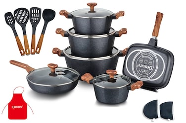 - <p><li>Country of Origin: China<p><li>Color Name: Darkgrey<p><li>Size: 1 x double fry pan, 1 x 20cm casserole with lid, 1 x 24cm casserole with lid, 1 x 28cm casserole with lid, 1x 32cm casserole with lid, 1x28cm shallow casserole with lid, 7pcs cooking tools<p><li>Material: Granite<p><li>Closure Fastener: Lid<p><li>Number of Pieces: 19<p><li>Set Includes: 1 x double fry pan,1 x 20cm casserole with lid, 1 x 24cm casserole with lid, 1 x 28cm casserole with lid, 1x 32cm casserole with lid, 1x28cm shallow casserole with lid, 7pcs cooking tools<p><li>Dishwasher Safe<p><li>Non Stick<p><li>Scratch Resistant<p><li>Oven Safe<p><li>PTFE/PFOA Free<p><li>use oil when cooking for the first time to extend the life of the coating<p><li>Do not use lid while cooking in the oven<p><li>Not suitable for microwave and induction cooking top<p><li>Do not store salty food in cookware to prevent damage<p><li>Although the coating is very durable, use with care when using metal or sharps tools on products.<p><li>What's In The Box: 1 x double fry pan, 1 x 20cm casserole with lid, 1 x 24cm casserole with lid, 1 x 28cm casserole with lid, 1x 32cm casserole with lid, 1x28cm shallow casserole with lid, 7pcs cooking tools
