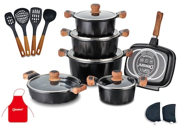 Dessini 19-Piece Non Stick Granite Cookware Set 20/24/28/32cm Casserole, 28cm Shallow Casserole, 32cm Double Fry Pan - PFOA Free