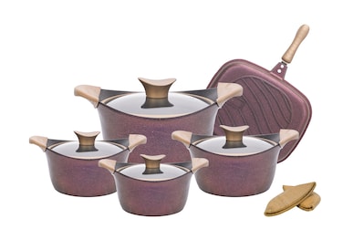 Complete your kitchenware collection with the Neoklein Titanium Granite 9-Piece Cookware Set. The cooking set includes 4 cooking pots with Non glass covers & 1 Titanuim Double Grill ,.You can make a variety of dishes, be it grilled or fried. With 9 thick layers of titanium, the cookware set ensures excellent heat distribution. Each product of the set is made from titanium granite for enhanced durability. All the items are free from PFOA, lead, and cadmium for safe and reliable consumption. Thanks to the Bakelite handles, the pots and pans are convenient to carry.