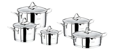OMS 10 Piece Stainless Steel Silver Cookware Set Made in Turkey 1057, 16x10 cm pot with lid, 20x12 cm pot with lid, 22x13 cm pot with lid, 24x14 cm pot with lid, and 24x8 cm shallow pot with lid